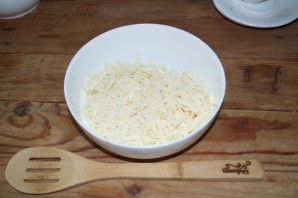 Сыр натрите на терке. Я взяла козий сыр. Он относится к сырам твердых сортов. По вкусу — близкий к адыгейскому или кавказскому.