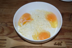 К сыру вбейте яйца. Добавьте немного соли и перца. Перемешайте.