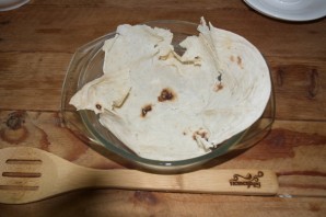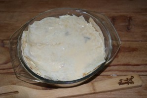 Поверх сыра снова выложите кусочки лаваша, а потом снова сыр — и так, пока все продукты не закончатся.
