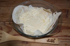 Форму для выпечки нужно смазать маслом. Порвите листик лаваша на несколько кусочков. Из кусочков выложите дно формы так, чтобы не было просветов.