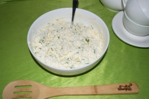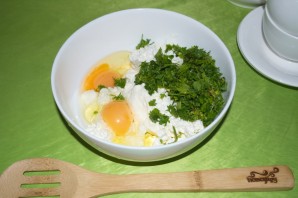 Измельчите зелень, добавьте к творогу.