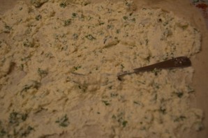 На тонкий лаваш распределите творожную массу. У меня лаваш небольшого размера. Я творожную массу поделила на 3 части и нанесла на каждый лист лаваша. После скрутила лаваш рулетом (каждый отдельно) и уложила в форму "улиткой".