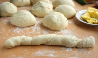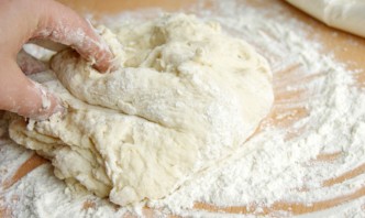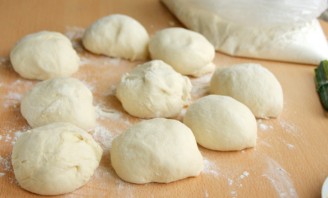 Выкладываем тесто на стол, присыпанный мукой. Еще раз обминаем руками и разделяем на 9 частей (шариков).