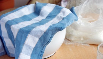 Затем перекладываем тесто в глубокую миску и накрываем полотенцем. Оставляем на 1 час для "подъема".