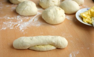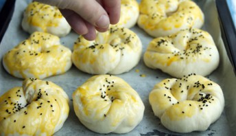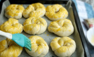 Перекладываем все заготовки на противень, застеленный бумагой для выпечки. Смазываем каждую булочку взбитым желтком.