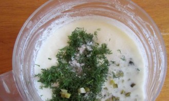 Whisk the kefir together with the whey. Add a pinch of salt and chopped herbs with cucumber. Optionally, add an ice cube.