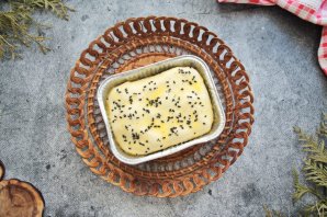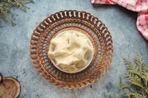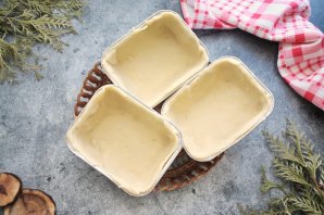 Тесто раскатайте в тонкий пласт и разложите в формочки, распределив по дну и бокам форм, лишнее отрежьте. Я брала алюминиевые 8 на 12 сантиметров, у меня получилось три штуки.