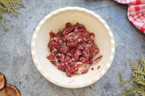 Говядину сполосните, обсушите и нарежьте мелкими кусочками. Выложите в миску, посолите, посыпьте мукой и перемешайте, чтобы каждый кусочек покрылся.