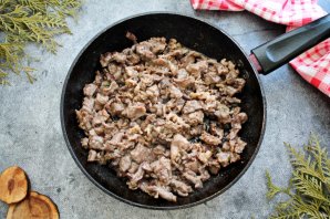 В сковороду налейте растительное масло и разогрейте на среднем огне. Выложите мясо в муке и обжаривайте в течение 5 минут, перемешивая.