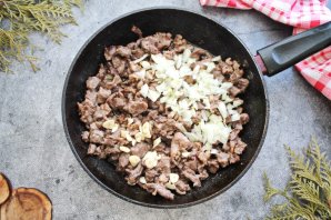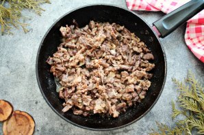 Убавьте огонь, накройте крышкой и тушите до готовности. Снимите крышку и дайте жидкости выпариться до густого соуса. Снимите сковороду с мясом с огня и остудите.