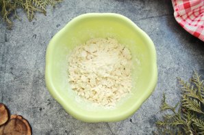 Холодное масло натрите на крупной терке, посолите, просейте туда муку и быстро перетрите руками в крошку.