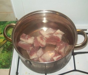 We thoroughly wash the meat, place it in a pot, and pour about 2 liters of water over it.