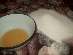 While the meat is boiling, we will prepare the noodles. Break an egg into a bowl, add a glass of water, a spoonful of oil, and beat everything well. Now add salt and gradually start adding flour.