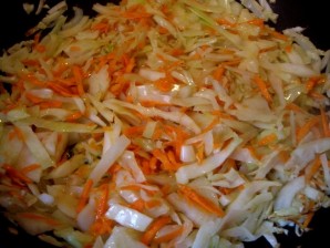 First, we need to shred the cabbage, chop the onion, and grate the carrots. Then, heat vegetable oil in a frying pan and add the chopped vegetables. Fry them for about 10 minutes over medium heat.