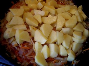 Then we add tomato paste and diced potatoes to the vegetables, pour in a little water, and mix everything. Cover the pan with a lid and simmer the vegetables over low heat until the potatoes are fully cooked.