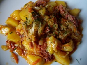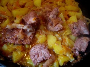 When the potatoes become soft, add the canned meat to the pan, mix everything, season with salt and pepper to taste, and let the bigos simmer for a few more minutes.