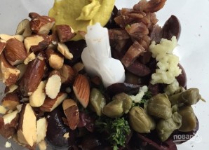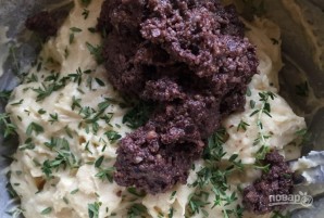 4. Добавьте листья тимьяна и 1/3 части полученной тапенады. Все тщательно перемешайте.