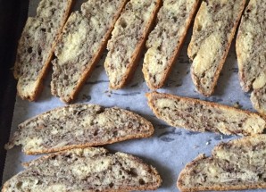 9. Положите кусочки бискотти снова на противень и верните в духовку, выпекайте в течение 30 минут, затем переверните кусочки и запекайте еще 10 минут. Остудите и храните в герметичном контейнере.