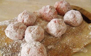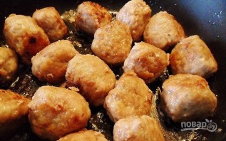 Pour vegetable oil into a skillet and place it on the stove to heat up. Put the meatballs coated in flour into the skillet and fry them in oil over medium heat until golden brown on all sides.