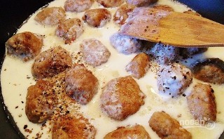 For the sauce, you will need sour cream and the remaining milk. Thoroughly mix both ingredients in a bowl and pour over the patties in the skillet. Cover with a lid and simmer for ten minutes until fully cooked.
