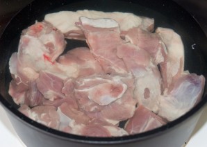 We cut the lamb brisket into pieces and rinse it under water. Then we cover the lamb with cold water, place it on the stove, and simmer for about an hour after boiling. Remember to skim off the foam that forms. After this time, remove the meat from the pot, strain the broth, and cook the soaked chickpeas in it for about 20 minutes.