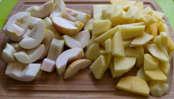 Now peel the apple and potato. Remove the core from the apple and cut it into 8 slices; cut the potato into small pieces as well.