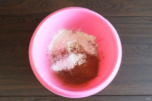 В чаше смешайте сухие ингредиенты: муку, какао, соль и разрыхлитель.