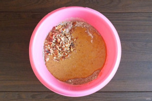 В чашу с сухими ингредиентами добавьте финиковую массу и дробленые орехи.