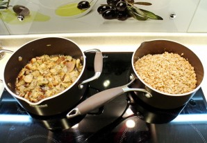 For the filling, sauté a chopped onion in vegetable oil, then add mushrooms and cook for another 10–15 minutes. At the end, remember to season the filling with salt and a little pepper. Here we are using forest mushrooms, previously boiled, but you can replace them with button mushrooms or other varieties. Meanwhile, while preparing the filling, you can start cooking the side dish to save time.