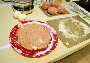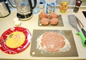 Next, we divide our minced meat into several equal balls; from this amount of minced meat, you should get 5-6 balls. Now, sprinkle flour on the table, place one meat ball onto it, and roll or flatten it into a patty. In a flat plate, beat one egg.