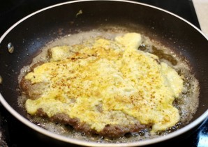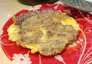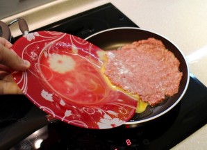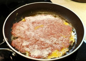 Heat vegetable oil in a frying pan and carefully place our assembly into it so that the egg is on the bottom and the meat filling is on top.