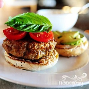 5. Смазать большим количеством смеси соуса Песто каждую половинку бублика. Выложить котлеты на нижнюю половину, затем ломтики помидора и листья базилика.