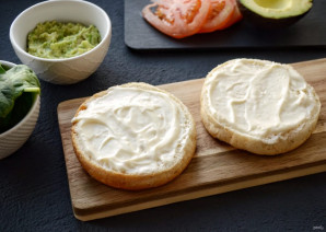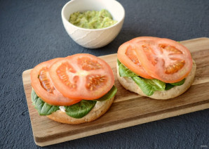 Нарежьте помидор кружочками. Авокадо разомните вилкой в пюре, добавьте лимонный сок, сухой чеснок и соль по вкусу.