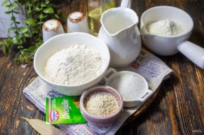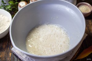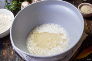 В теплой воде разведите сухие дрожжи и сахар. Оставьте на минут 5, чтобы появилась пенная шапочка, так мы будем знать, что дрожжи свежие и пригодны к работе.