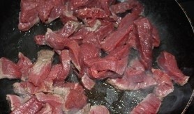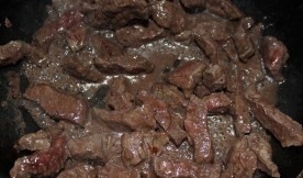 Sauté beef pieces in vegetable oil, lightly dusted with flour.
