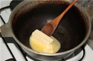 To prepare chakhokhbili, we will need a kazan or a pot with thick walls. Place the butter into the kazan and melt it.