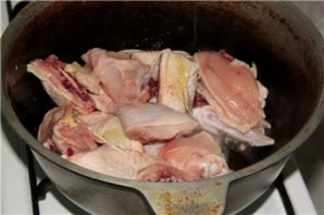 Cut the chicken into portion pieces, rinse, and place in a cauldron.