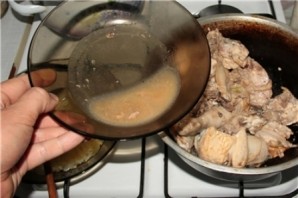 Cover the cauldron with a lid and simmer the chicken over low heat for about 5 minutes, then carefully drain off the accumulated juice (we will need it later). Now increase the heat and sear the chicken on all sides until golden brown.