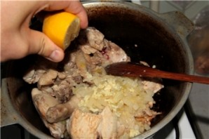Then transfer the onion with oil to a cauldron, add the juice of half a lemon and minced garlic. Fry everything over high heat for 5 minutes.