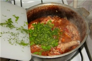 While everything is frying, we finely chop the tomato, pepper, and potato. Add the vegetables to the pot, pour in the juice from the chicken, add salt and spices. Cover the pot with a lid and simmer for 10 minutes over medium heat. Add the chopped herbs at the very end. About 5 minutes later, turn off the heat and serve the chakhokhbili onto plates. Enjoy your meal!