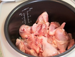 Then place the chicken in the multicooker, add a few drops of vegetable oil, and sauté, stirring, in frying mode.
