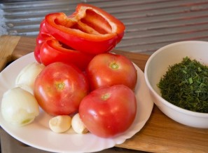 Blanch the peppers and tomatoes, and remove the skin from the tomatoes.