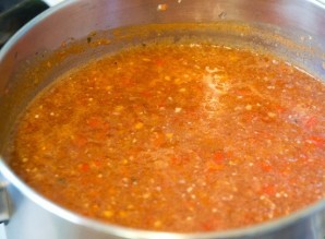 Place tomatoes, peppers, onion, and garlic in a blender and puree. Add soy sauce, wine, bay leaf, pepper, salt, and khmeli-suneli.