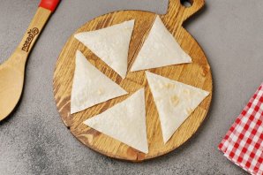Смажьте лаваш взбитым яйцом. Затем при помощи кухонных ножниц нарежьте полосками (в зависимости от желаемого размера чипсов). А затем каждую полоску разрежьте на квадратики или вот такие треугольники как у меня.