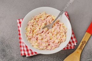 Колбасу и сыр натрите на тёрке. Добавьте майонез, остатки взбитого яйца и перемешайте.