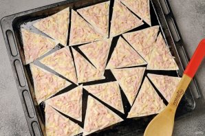 Нарезанный лаваш выложите на противень и смажьте начинкой. Запекайте в духовке при температуре 180 градусов около 15 минут. Время зависит от желаемой готовности чипсов, кто-то любит помягче, а кто-то предпочитает именно похрустеть.