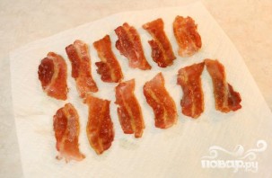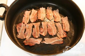1. Нарезать ломтики бекона на тонкие полоски и обжарить в большом сотейнике на слабом огне около 10 минут с каждой стороны.