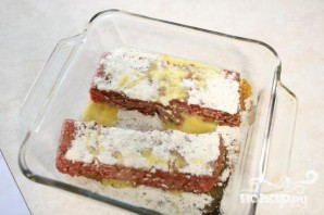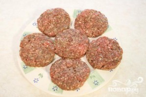 3. Замесить массу руками. Ножом разделить мясо на 6 частей. Из каждой части руками сформировать котлету. Пальцем сделать углубление в центре каждой котлеты. Посыпать с обеих сторон приправой для стейка. Смазать полученные котлеты размягченным сливочным маслом.