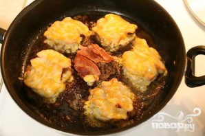 6. Жарить около 30 секунд, а затем добавить бекон и ломтики сыра. Накрыть крышкой и жарить еще около 2 минут.