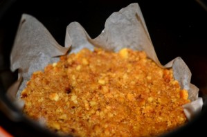 Тщательно смешайте масло и печенье. На дно мултиварки выкладываем бумагу для выпекания. Теперь заполняем ее массой из печенья и масла.